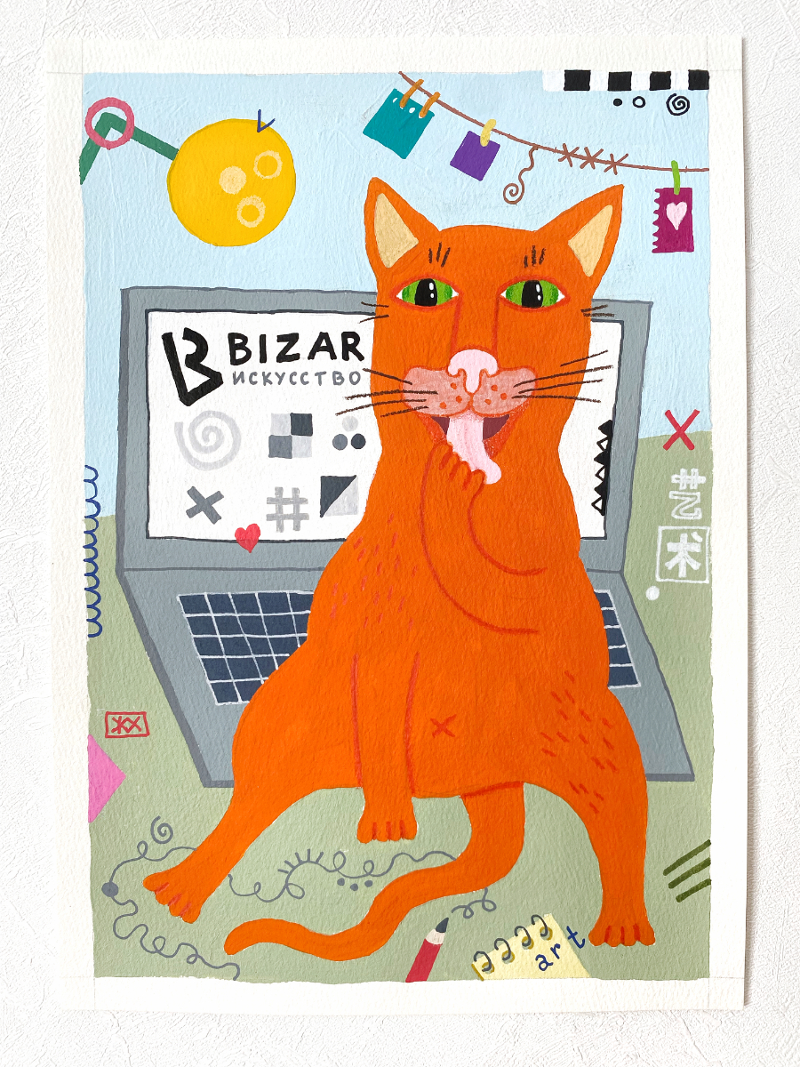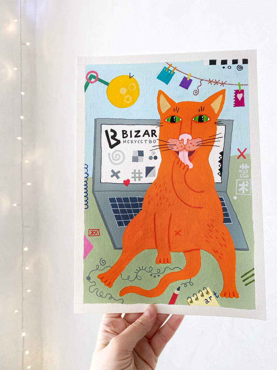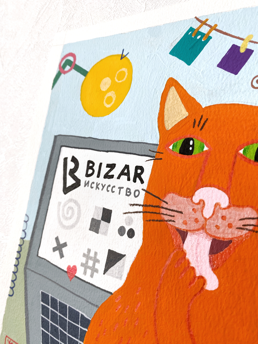 Передо мной стояла интересная и непростая задача: создать картину для фирменных открыток, которые BIZAR отправляет вместе с заказами. Я решила нарисовать картину кота, тем более я сейчас как раз разрабатываю новую серию картин с котиками. Мой пушистый муза — уютный рыжий кот.
