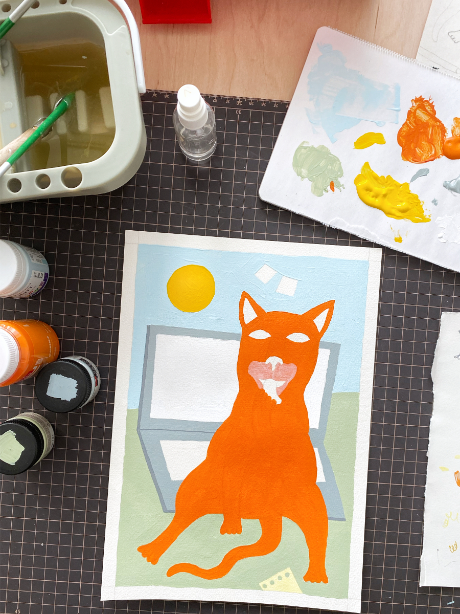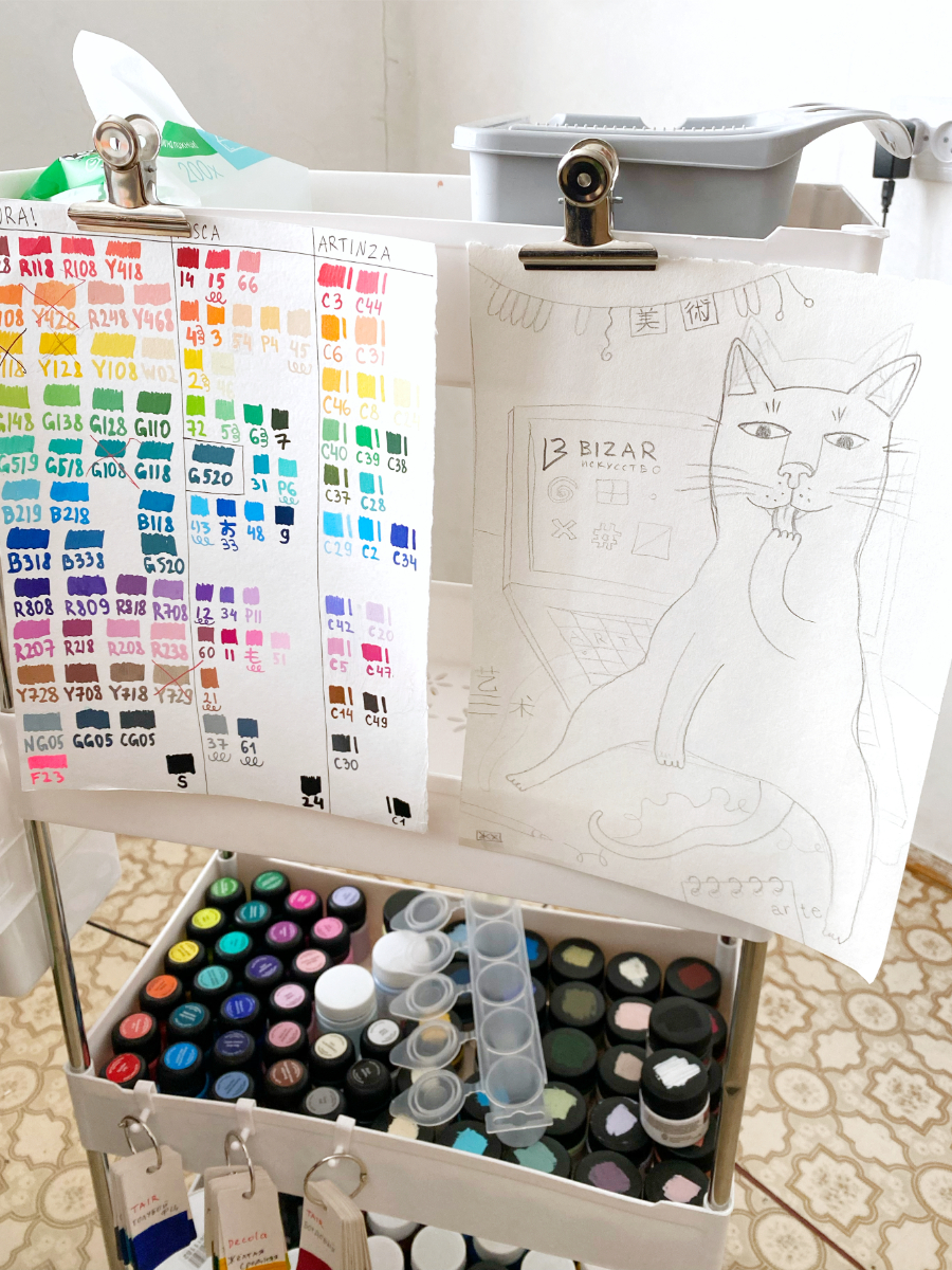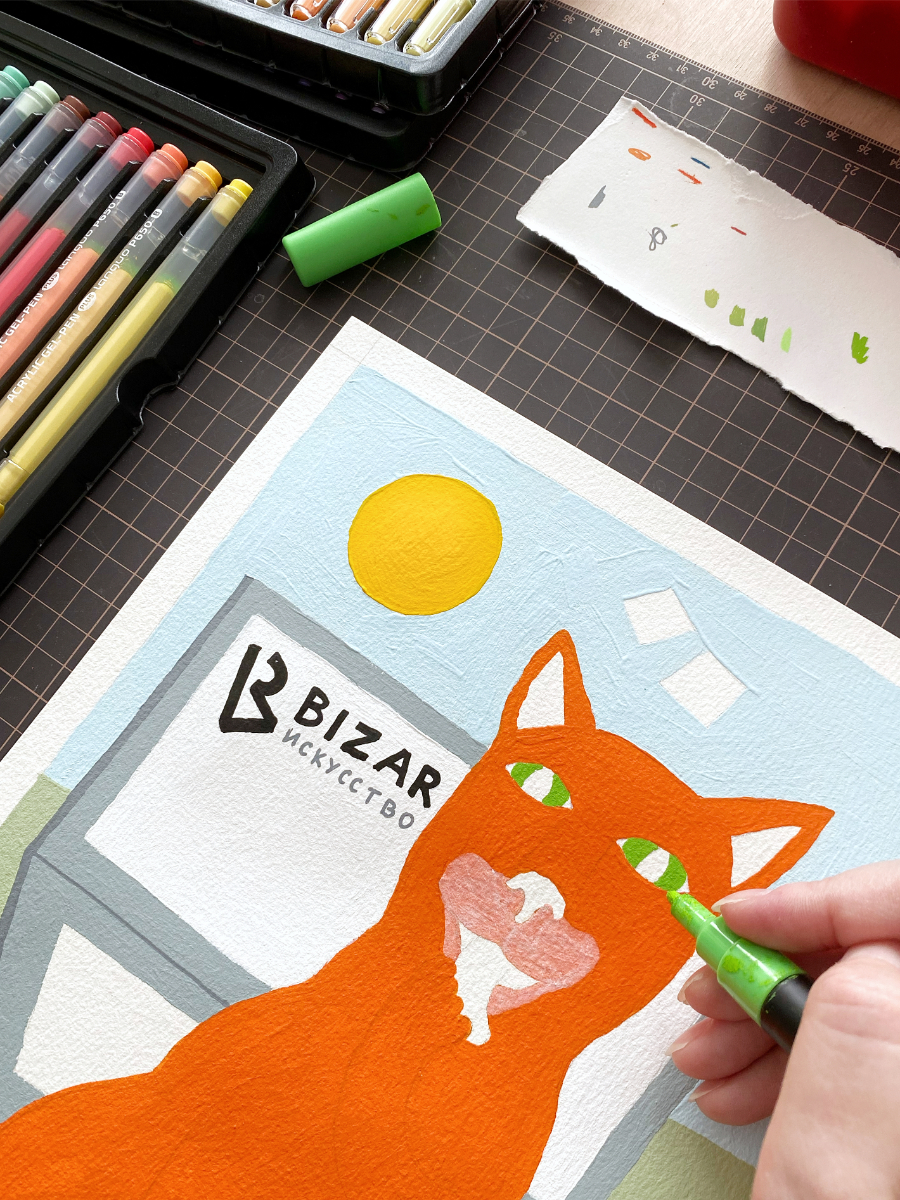 Передо мной стояла интересная и непростая задача: создать картину для фирменных открыток, которые BIZAR отправляет вместе с заказами. Я решила нарисовать картину кота, тем более я сейчас как раз разрабатываю новую серию картин с котиками. Мой пушистый муза — уютный рыжий кот.